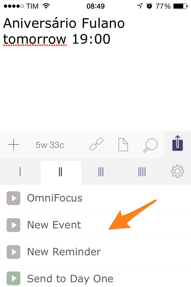 O Fantastical também tem um recurso avançado chamado esquema URL. Não se preocupe em saber o que é isso, apenas entenda que é uma maneira, no iPhone, de um aplicativo chamar outro. O Drafts também suporta esquemas URL, e isso permite criar ações. Eu tenho uma chamada “New Event” (gosto de configurar meus apps em inglês para treinar e porque não gosto das traduções que geralmente encontro), que pega esse texto do Drafts e manda para o Fantastical processar (lembrando que ele entende esta linguagem natural).