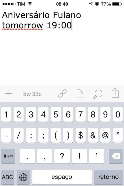 Para agenda, eu uso um app muito bacana chamado Fantastical 2) (falei dele há pouco tempo). Ele não é nem de longe essencial, já que eu poderia usar a agenda nativa (ou até uma agenda de papel), mas ele tem um recurso interessante de permitir linguagem natural. Em inglês, você pode digitar uma frase exatamente como acima e ele vai entender, marcando um evento no dia especificado.