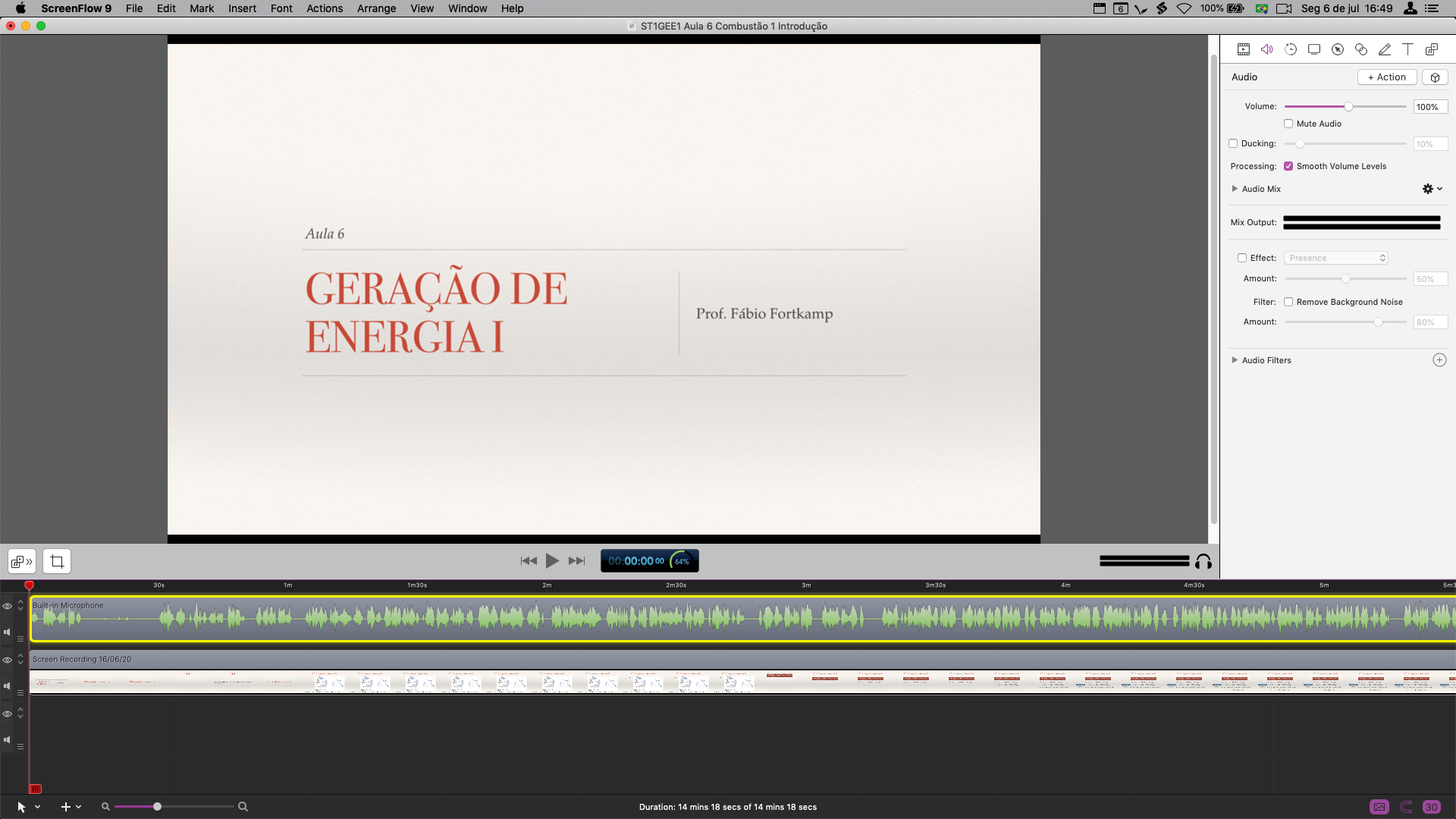 Seguindo recomendações que vi em praticamente todo lugar (mas essa página do MIT é um bom guia geral para começar a se preparar para dar aulas online), tento manter vídeos de no máximo 20 minutos. Dizem que o ideal mesmo seria 5-6 minutos, mas isso aumenta o número de vezes que tenho de parar e começar a gravar, e não sei o quão ótimo isso seria.
