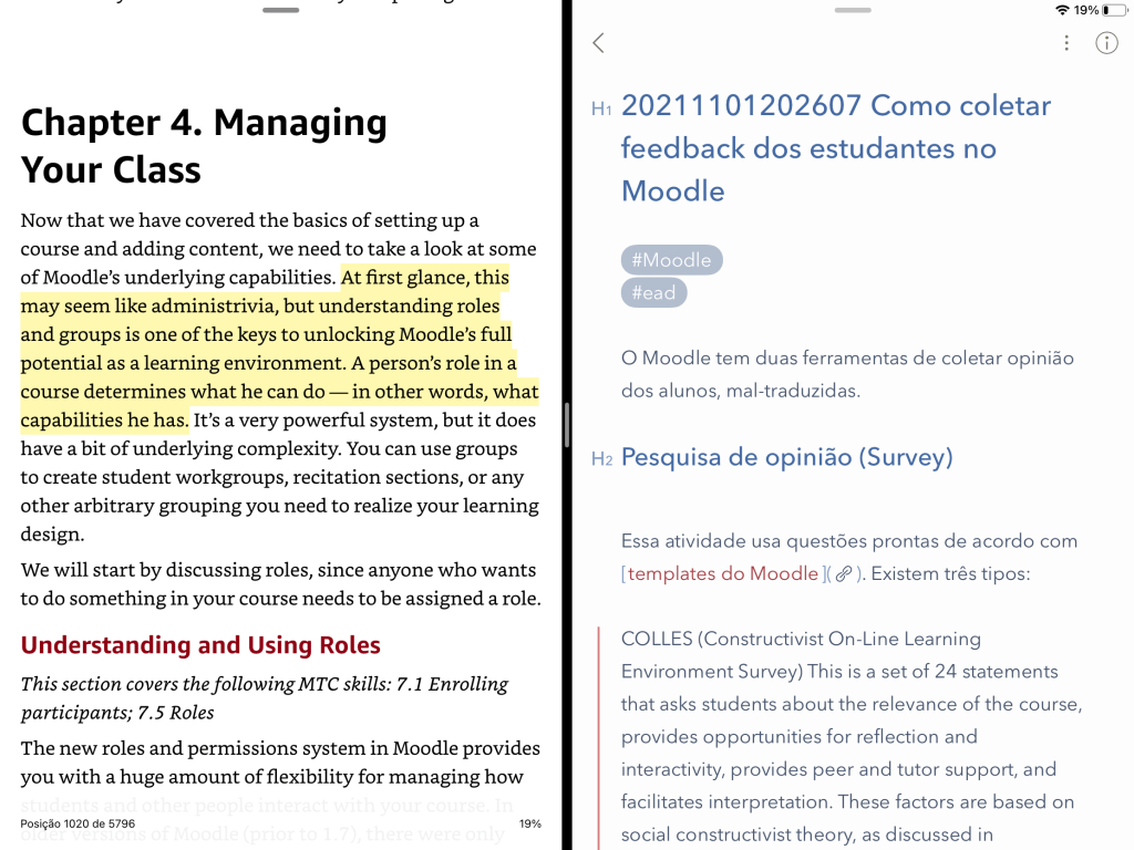 A habilidade de colocar apps lado a lado no iPad permite um fluxo de trabalho perfeito; de um lado o Kindle, com trechos sublinhado, e do outro o Bear, onde vou escrevendo minhas impressões com minhas próprias palavras.