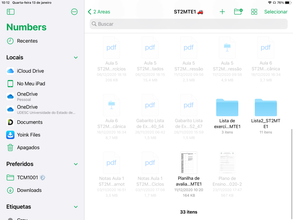 Parte do trabalho de preparar aulas é preparar planilhas de notas, para me ajudar a avaliar trabalhos e apresentações. O Numbers para iPad é ótimo. A integração com provedores de documentos é sensacional; ao navegar no app, só aparecem habilitados os arquivos que podem ser abertos no Numbers: