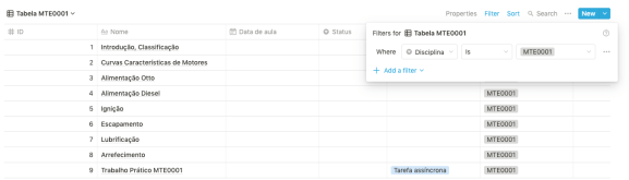 - Status: uma propriedade do tipo “Escolha” que indica em que estágio está a preparação da aula: “A fazer”, “Notas no papel”, “Slides prontos”, “Ministrada”