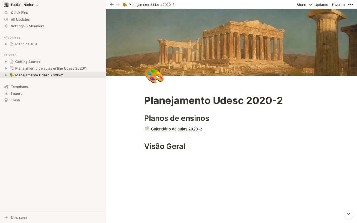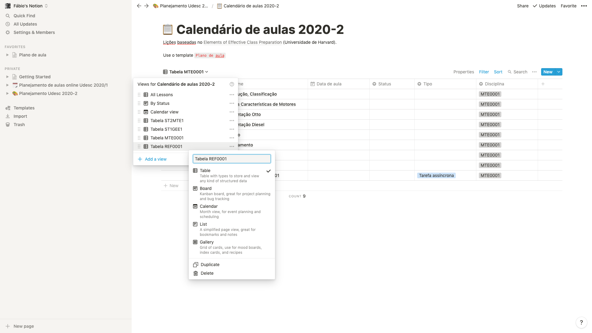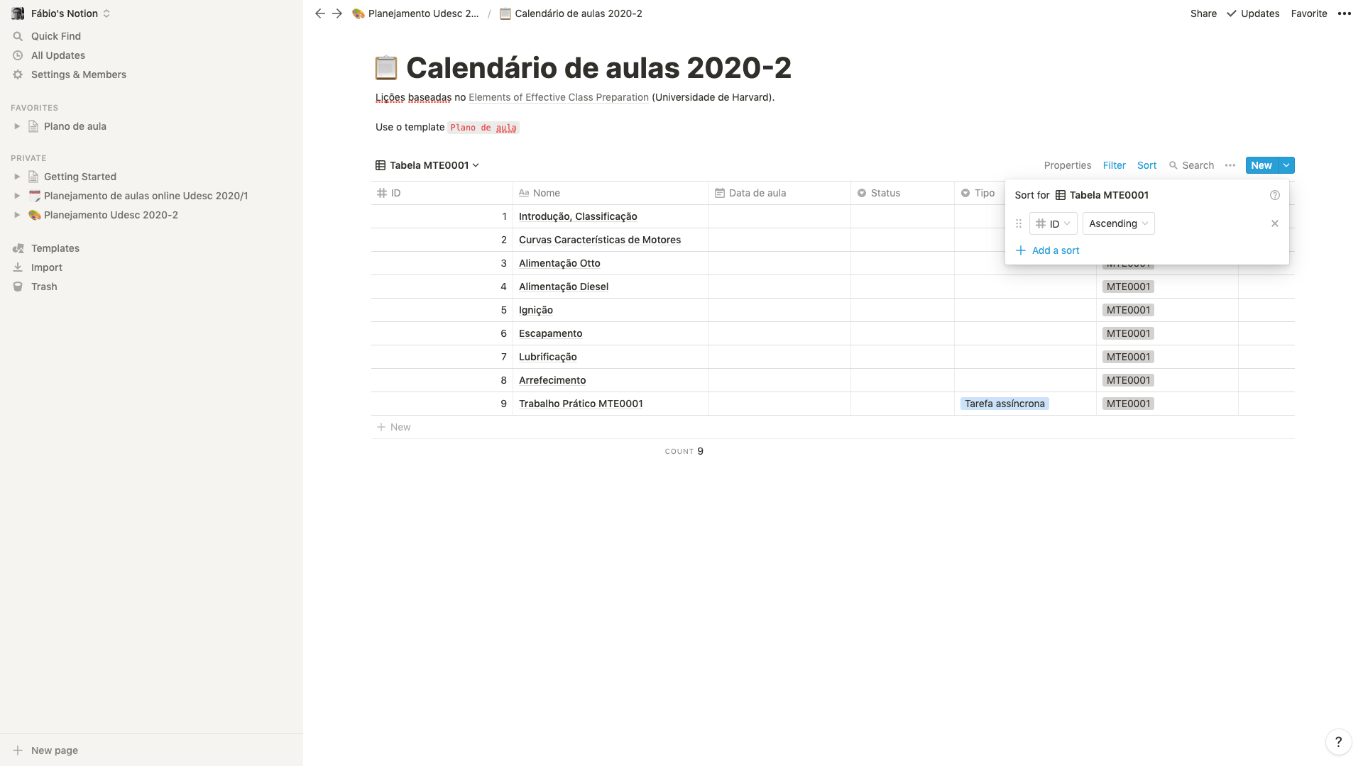Quando as aulas do primeiro semestre de 2020 foram retomadas pós-interrupção pandêmica, eu apressadamente criei uma tabela básica no Notion, que listava os temas em cada dia: