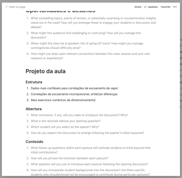 O Notion vem com templates prontos, inclusive sobre educação. Para montar a tabela, eu comecei adaptando o template Lessons Plans para a tabela, e traduzindo o template de nota Lesson Plan (no singular) para usar para cada aula. Assim, clicando em cada linha da tabela de aulas, eu posso começar a rascunhar ideias para as aulas, usando os prompts do template: