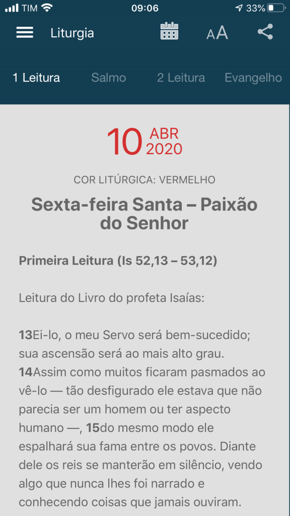 O app Liturgia Diária da Canção Nova tem sido de grande ajuda nesse período. O app me mostra a Liturgia do dia e ainda traz uma homilia e um texto sobre o santo do dia. Muitas vezes eu apenas consulto as leituras no app mas leio de fato na minha Bíblia, mas ocasionalmente, quando estou cansado demais num dia corrido, eu leio no próprio app e medito um pouco.